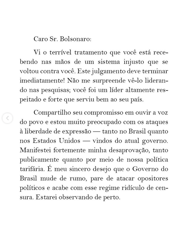 “Estou muito preocupado com os ataques à liberdade de expressão — tanto no Brasil quanto nos Estados Unidos — vindos do atual governo. Expressei fortemente minha desaprovação, tanto publicamente quanto por meio da nossa política tarifária. É minha sincera esperança que o Governo do Brasil mude de rumo, pare de atacar os opositores políticos e encerre esse regime ridículo de censura. Estarei observando de perto”, completou Donald Trump.
