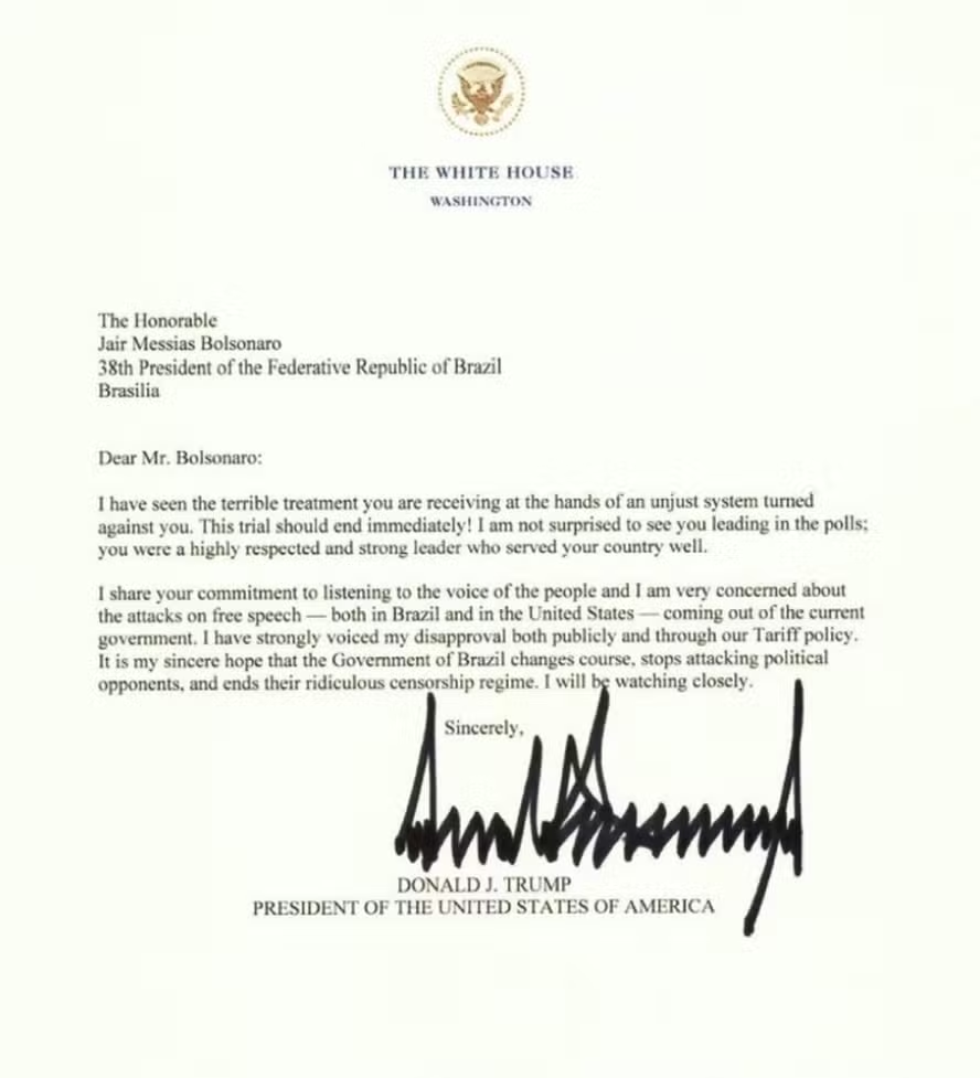 O presidente dos Estados Unidos, Donald Trump, publicou nesta quinta-feira, 17, uma carta oficial direcionada ao ex-presidente Jair Bolsonaro. Nela, Trump afirma que Bolsonaro é vítima de um “sistema injusto que se voltou contra” ele.